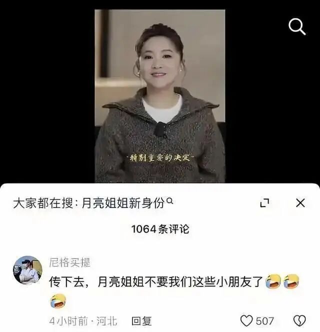 央视同事尼格买提第一时间留言:“传下去,月亮姐姐不要我们这些小朋友了。”
